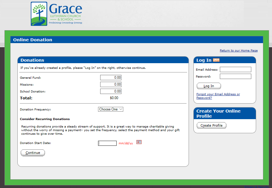 Thank you for your interest in online donation. Please click on the icon to the left for the online donation form. The Spanish Fork Mission and Grace Lutheran Church & School is a single organization and can not operate without the generous support of our Grace family through tuition and donation. Online donation provides a simple, secure, and convenient way to donate to Grace.